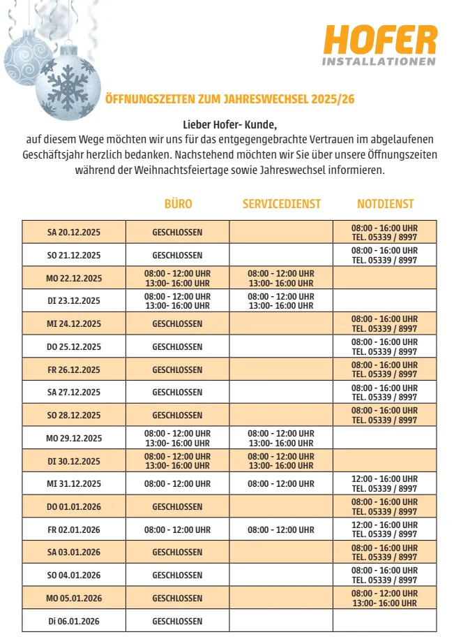 Öffnungszeiten zum Jahreswechsel 2025/26